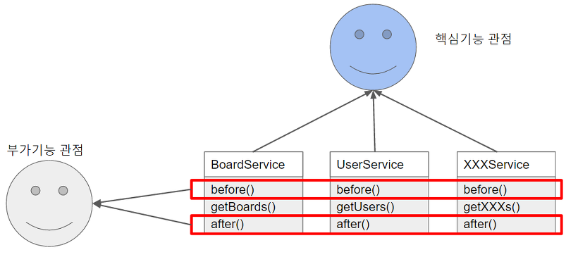 프로그래밍을 하다 보면, 공통적인 기능이 많아집니다. 이러한 공통기능을 모듈에 적용하기 위한 방법으로 상속을 이용할 수 있습니다. 하지만 JAVA에서는 다중 상속이 불가능합니다. 그리고 이러한 모듈을 계속 상속받아 공통 기능을 부여하기에는 한계가 있을 뿐더러 보기에도 불편하고 효율성도 떨어집니다. 이를 해결하기 위해 나타난 AOP는 핵심 기능과 공통 기능을 분리해, 공통 기능을 필요로 하는 핵심 기능들에 적용하는 방식입니다. 아래 그림과 같이, 붉은 상자에 있는 공통 부분들을 분리해내는 것입니다.
