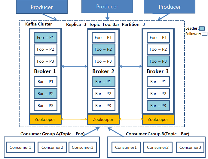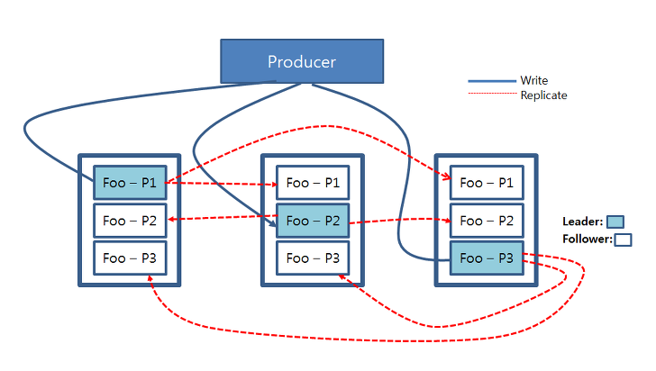 Kafka에서의 read, write는 Cluster 내의 Leader에만 적용됩니다. 하늘색으로 칠해진 Partition들은 Leader이며 이 Partiton들에게 Producer가 write 연산을 진행합니다. 그리고 Leader에 연산이 진행되고 나면, 업데이트된 데이터는 Follwer들에게로 복사됩니다.